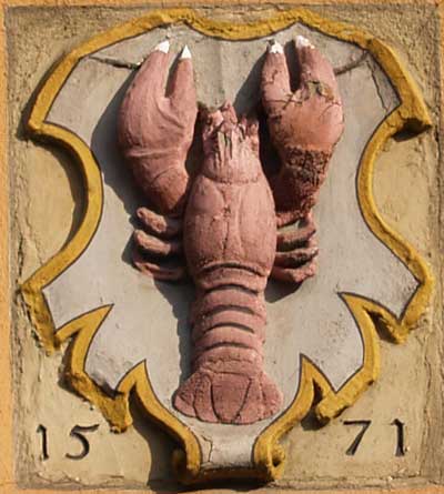 Ein redendes Wappen Krebs von 1571 am Hotel Eisenhut in der Herrngasse 4, in Silber ein roter aufrechter Krebs. Die hier nicht dargestellte Helmzier wäre nach dem Schragschen Geschlechter- und Wappenbuch auf dem Helm mit rot-silbernen Decken zwei rote Krebsscheren. Die Stammreihe beginnt im 16. Jh. mit Johann Krebs. Weiterhin ist das Wappen im Siebmacher Si5 247 abgebildet. Ein weiteres Wappen dieser Familie ist im Spitalbereich zu finden. Das Motiv ist kein Unikat, ebenso gibt es diesen Schild für eine Luzerner Familie Krebser, für eine Familie Krebs im Siebmacher Band: SaA Seite: 93 Tafel: 59 und für die Familie Cryfftz, Cryfts, Krieffts oder auch Krevers (= Krebs) in Bernkastel-Kues. Alle drei vorgenannten Wappensteine befinden sich am selben Haus, einem dreigeschossigen Giebelbau mit steilem Satteldach und Fachwerkobergeschoß und in Fachwerk ausgeführtem Giebel, bez. 1564 und 1571.