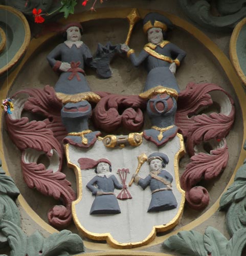 Bei dem Wappen handelt es sich um ein in einem gespaltenen Schild zusammengeschobenes Ehewappen. Die heraldisch rechte Hälfte und die Helmzier darüber stellen das gewendete Wappen Schwarzmann dar, in Silber die Dreiviertelfigur eines schwarzgekleideten Mannes mit roter Zindelbinde, deren Enden nach rechts abflattern, den linken Arm abgewinkelt, den rechten eingestemmt, in der Linken drei silberne Pfeile mit rotem Flitsch haltend (Motiv gespiegelt), auf dem Helm mit rot-silbernen Decken wachsend die Schildfigur. Eine qualitativ bessere Darstellung findet sich in der Herrngasse 7 (siehe dort). Das Wappen Erhard wird im Schragschen Geschlechterbuch abgebildet, in Silber wachsend ein blaugekleideter Mann mit Schärpe, auf dem Haupt eine blaue Zipfelmütze, den rechten Arm abgewinkelt, den linken eingestemmt, in der Rechten einen hier goldenen Streitkolben haltend, auf dem Helm wachsend die Schildfigur, mit leichten farblichen Differenzen. Das Wappen wird ferner beschrieben im Siebmacher Si5 252 Rothenburgische und bei Schöler, Familienwappen Seite 42 und Tafel 118 Nr. 7. Bei Schrag beginnt die Stammreihe mit Nikolaus Erhart aus Mainbernheim, der im 16. Jh. lebte. Hier sind beide Männer blau gestrichen, doch muß der eine (redendes Wappen: schwarzer Mann) korrekterweise schwarz sein.