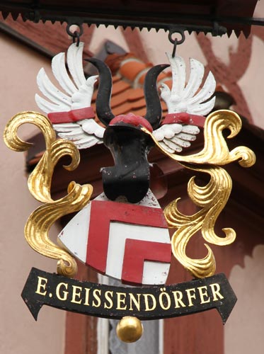 Eine moderne, in Blech ausgeführte Darstellung des Wappens Geissendörfer wird an der Gebäudeecke als Auslegerschild verwendet. Im Gegensatz zur Darstellung am Haus selbst, das dreimal gesparrt ist, haben wir hier eine Teilung mehr, es handelt sich um zwei Sparren. Ein weiterer Unterschied ist das Paar Schwarzer Büffelhörner zwischen dem Flug des Kleinodes. Im Siebmacher findet sich das Wappen unter der Schreibweise Geisendorfer mit drei sparrenweisen Teilungen, also wie im alten Wappenstein, im Band: BayA3 Seite: 181 Tafel: 128 für die Rothenburger Familie, jedoch auch mit den Büffelhörnern in der Helmzier, vgl. auch das hinsichtlich des Schildes ähnliche Wappen einer gleichnamigen Familie in Nürnberg im Siebmacher Band: BayA1 Seite: 99 Tafel: 98, aber mit einer gänzlich anderen Helmzier.