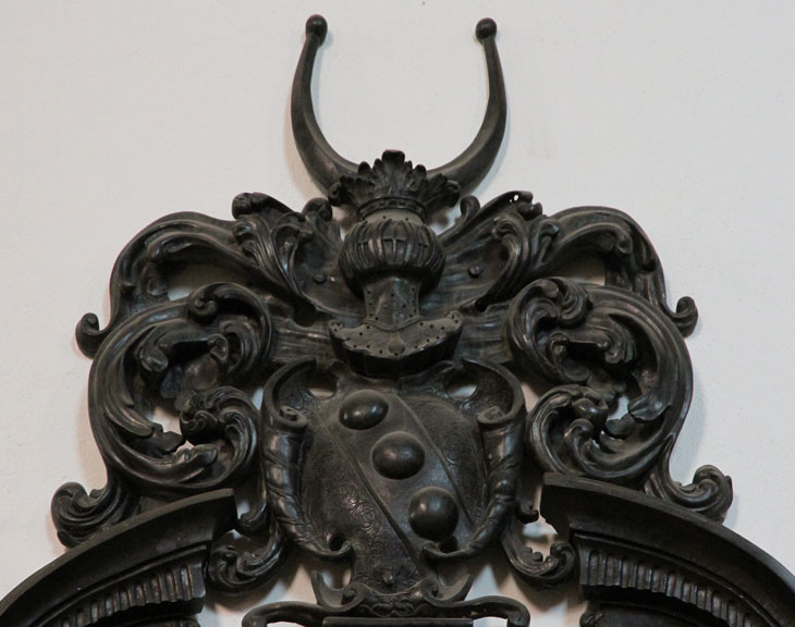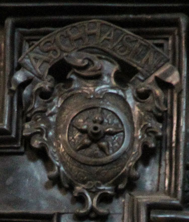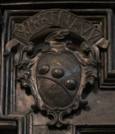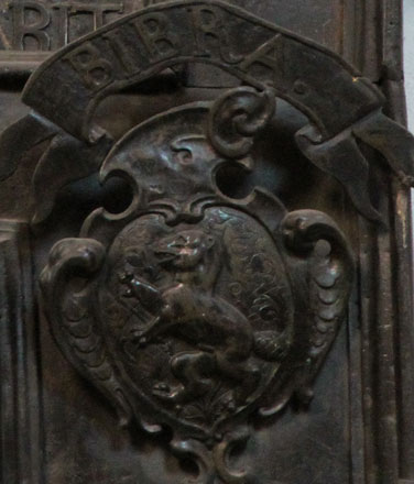 Der Schild steht für den Vater, Konrad von Wernau, den Großvater väterlicherseits, Hans Veit von Wernau, und dessen Vater, Veit von Wernau. Darunter fehlt der zweite Schild, hier müßte nach der Logik der Ahnenprobe der Schild der von Rechberg zu Hohenrechberg kommen (in Gold zwei mit den Rücken gegeneinandergekehrte rote Löwen mit verflochtenen Schwänzen) für die Großmutter väterlicherseits, Anna von Rechberg, und ihren Vater, Konrad von Rechberg.