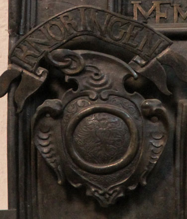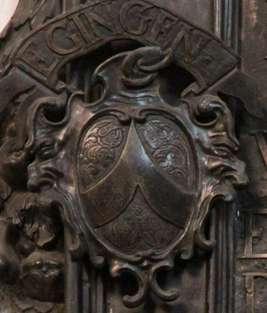 Der dritte Schild in der Folge zeigt das Wappen der von Egingen = Ehingen (in Schwarz ein hier eingebogener goldener Sparren) für die erste Urgroßmutter väterlicherseits, Gertraud von Ehingen. Darunter schließt der Schild der von Knöringen (in Schwarz ein silberner Ring) die Reihe ab, er steht für die andere Urgroßmutter väterlicherseits, Katharina von Knöringen.