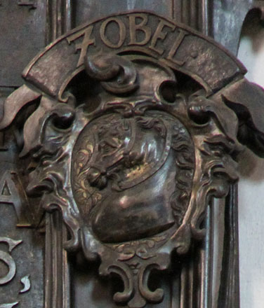 Zu beiden Seiten des zentralen Inschriftenfeldes befindet sich in zwei Spalten die Ahnenprobe des Domherren, aus insgesamt acht mit einem jeweils darüber befindlichen Schriftband beschrifteten Kartuschen bestehend, die unteren beiden aus dem Lot heraus nach innen eingerückt. Auf der Schwertseite ist das zweite Wappen von oben verlorengegangen. Die heraldisch rechte Spalte (Schwertseite) beginnt oben mit dem Wappen der von Wernau (s.o.).