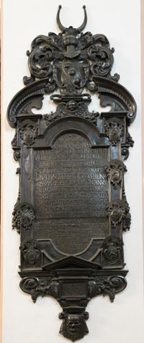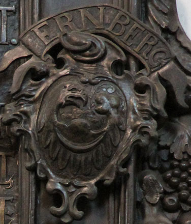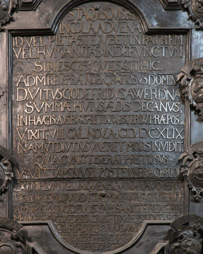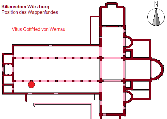 Dieses aus Metall gefertigte Epitaph hängt am zweiten südlichen Hauptschiffpfeiler des Würzburger Domes, ins südliche Seitenschiff gerichtet. Es ist für Veit Gottfried von Wernau (11.9.1601-25.10.1649). Das gesamte Zentralfeld wird von der Inschrift eingenommen: "STA QVISQVIS ES / INCOLA ADVENA / ID VEL PIETAS TE IVBET IN PATREM / VEL HVMANITAS IN DEFVNCTVM / SI NESCIS QVIESCIT HIC / ADM(ODVM) REV(ERENDVS) PRAENOB(ILIS) GRATIOSVS DOMINVS / D(OMINVS) VITUS GODEFRIDVS A WERDNAV / SVMMAE HVIVS AEDIS DECANVS / IN HAVGIS AD S(ANCTI) BVRCH(ARDI) ET IN WESTERW(INKEL) PRAEPOS(ITVS) etc. / VIXIT VIII CAL(ENDIS) NOV(EMBRIS) A(NNO DOMINI) MDCXLIX (= 1649) / NAM VT DIVTIVS VIVERET MORS INVIDIT / QVIA CVNCTIS ERAT PRETIOSVS / VIVIT TAMEN VEL POST FVNERA CLARIOR / EXEMPLVM RELINQVENS QUOD ITA VIXERIT / DOLOREM QVOD ITA MATVRE OBIERIT / AMOREM QVOD SVOS TAM SANCTE REXERIT / MEMORIA(M) QVOD AEDES SACRAS ET PAVPERES DITARIT / GLORIA(M) QVOD CVLTV(M) DIVINV(M) / EREXERIT HINC VIATOR EI BENE PRECARE". Veit Gottfried von Wernau wurde in Pfauhausen geboren, und im Alter von 9 Jahren begann seine kirchliche Laufbahn: Christoph Ulrich von Würtzburg war verstorben, und die freigewordene Domherrenstelle bekam Veit Gottfried am 30.10.1610. 1626 wurde er Kapitelherr, und 1627 Domdechant. Er war außerdem Propst von St. Burkard in Würzburg (27.3.1645-1649), Propst von Stift Haug und von Wechterswinkel.