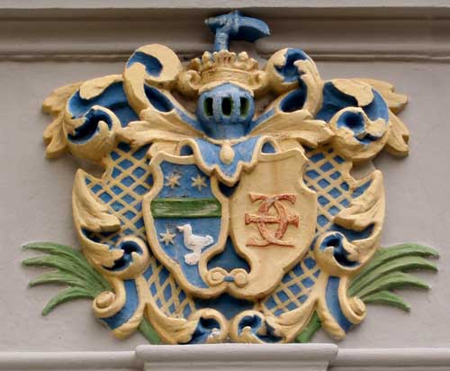 Das Allianzwappen zwischen Akanthus-Voluten zeigt unter einem einzigen Helm (Sonnier) zusammengestellt das Wappen des Ehemannes Alexander Wilhelm Sonnier heraldisch rechts und auf der linken Seite das Wappen seiner Frau Maria Ludovika Antonia Umbscheiden.