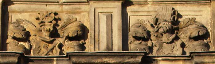 Der Erker ist auf allen drei Ebenen mit Wappen geschmückt, auf beiden Seiten je zwei Paare, auf der Frontseite ganz oben zwei Wappenschilde, die zusammen das Amtswappen bilden, darunter auf zwei Ebenen jeweils zwei Paare, also insgesamt eine 16er Ahnenprobe rund um das Amtswappen.