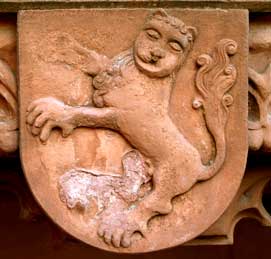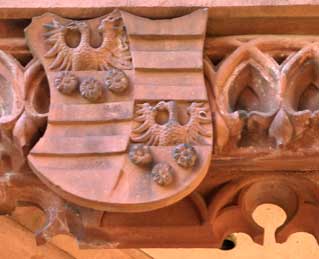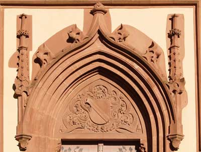 Über dem Haupteingang zur Kapelle im Tympanon ein Wappen, das aus dem Rahmen fällt, sowohl stilistisch als auch inhaltlich. Es sei daran erinnert, daß Wertheim, als 1806 die Fürstentümer mediatisiert wurden, zum Großherzogtum Baden kam. Das großherzoglich-badische Wappen ist hier schon in seiner reduzierten Form angebracht.