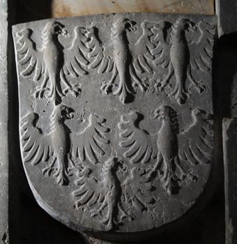 Das achte, hier nicht abgebildete Wappen ist das der Hase von Dieblich, in Rot ein goldener Pfahl, auf dem helm mit rot-goldenen Decken ein mit Spitzen von Gold und Rot geteilter Schwanenrumpf. Die in der Literatur getroffene Zuordnung von der Leyen ist unzutreffend.