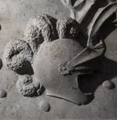 Detail: Helm mit hochgeklapptem Visier und Federschmuck. |