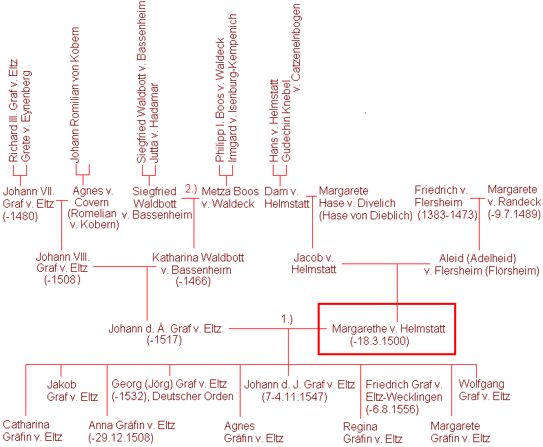 Hier geht es um die letztere, die am 18.3.1500 verstorbene Margarethe v. Helmstatt. Sie war die Tochter von Jacob v. Helmstatt, zu Dürrcastel, pfälzischer Hofmeister, gefallen bei Metz, und dessen Frau Aleid (Adelheid) v. Flersheim (Flörsheim), und ihr Ehemann war Johann d. Ä. Graf v. Eltz (-1517, andere Quellen: 1504?), Sohn von Johann VIII. Graf v. Eltz (-1508), dessen Frau Katharina Waldbott v. Bassenheim (-1466).