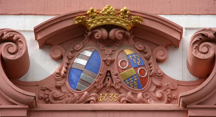 Über dem rückseitigen Portal zum Hof hin ist ein weiteres Allianzwappen identischen Inhaltes angebracht, auf 1735 datiert (Abb. oben). Auch hier werden beide Ovalkartuschen unter einer Blattkrone zusammengestellt. Der architektonische Rahmen ist jedoch ein völlig anderer, weil das Wappen hier in der Portalbekrönung zwischen zwei einwärts eingerollten Voluten unter einem Segmentbogen als Abschluß positioniert ist.