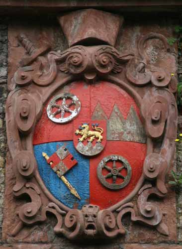 Das Material dieses Wappens ist allerdings nicht Sandstein, sondern gebrannter Ton: Während der französischen Besatzung wurden alle Wappensteine des Kurfürsten herausgeschlagen, weil sie als Symbol der Feudalherrschaft galten und sich der ganze Haß der Revolutionäre 1792 an den Wappen entlud, wie überall, wo sie hinkamen. Die groteske Maske und die beiden Löwen an den beiden Seiten des Giebels hingegen sind noch original. Auf dem Torgiebel erinnert eine Figur des hl. Jakobus an das um 1050 errichtete Benediktinerkloster St. Jakob, das einst auf dem Gelände der Zitadelle stand.