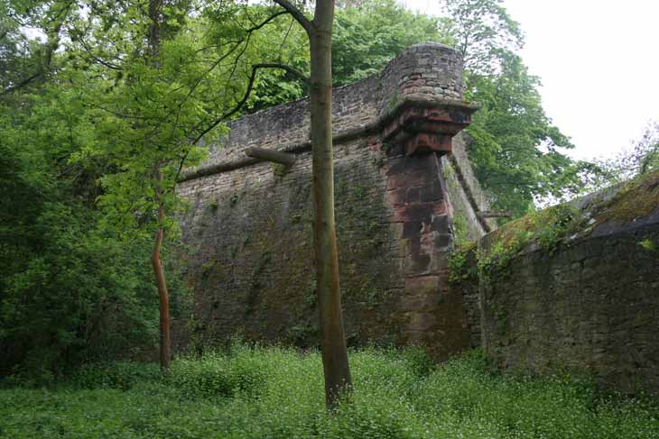Abb.: nördliche Face (= Frontmauer) der Bastion Tacitus mit der Basis für einen Wacherker an der scharf ausgezogenen Spitze rechts im Bild.