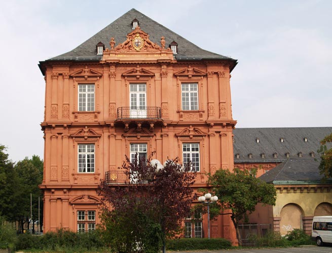 Die westliche Stirnseite des Nordflügels des Mainzer Schlosses. Am Balkon des ersten Obergeschosses, hier durch den Baum verdeckt, befindet sich das Breidbach-Wappen. Der Balkon im zweiten Obergeschoß ist ohne Wappen. Im Giebel befindet sich ein Ostein-Wappen.
