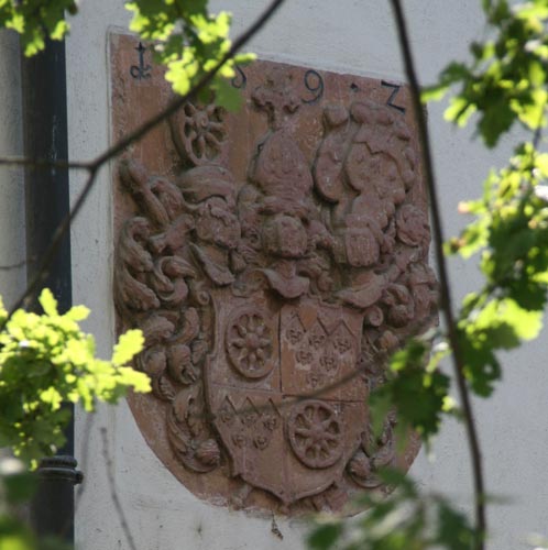 Der auf das Jahr 1592 datierte Wappenstein des Mainzer Fürstbischofs Wolfgang von Dalberg (regierte 1582-1601) ist über dem steinumrahmten Eingangsportal angebracht. Sein Wappen ist geviert, Feld 1 und 4: in Rot ein silbernes, achtspeichiges Rad, Erzstift Mainz, Feld 2 und 3: unter einem mit drei Spitzen abgeteilten, goldenen Schildhaupt in Blau 6 (3:2:1) silberne Lilien, Stammwappen der Kämmerer von Worms, genannt von Dalberg. Dazu werden drei Helme geführt: Helm 1 (Mitte): auf einem roten Kissen mit goldenen Quasten eine Inful, Bischofswürde, Helm 2 (rechts): auf einem roten, hermelingestulpten Hut (Kurhut) ein aufrecht stehendes, silbernes, achtspeichiges Rad, Helmdecken rot-silbern, Erzstift Mainz, Helm 3 (links): auf dem blau-golden bewulsteten Helm mit blau-goldenen Decken ein Flug, dessen goldener oberer Teil mit drei Spitzen abgeteilt ist, und der ansonsten in Blau 6 (3:2:1) silberne Lilien zeigt, Stammkleinod der Kämmerer von Worms, genannt von Dalberg. Ein Vortragekreuz steht senkrecht hinter dem mittleren Helm; das gestürzte Schwert und der Krummstab hinter dem Schild schräggekreuzt.