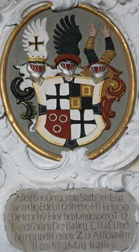 25.7.1600 Hugo Dietrich von Hohenlandenberg (Landenberg), Landkomtur 1578-1600 (Stammwappen ist geviert aus: Komponente 1: Schwarz-golden geviert in den Feldern 2 und 3. Komponente 2: In Rot 3 (2:1) silberne Ringe in den Feldern 1 und 4 (Stammwappen Landenberg). Helmzier 1: Zwei aufwärts gerichtete, wie die Felder 2 und 3 tingierte und an den Ärmeln außen mit je drei Knöpfen versehene Arme. Hier übereck gold-schwarz geteilt, aber auch jeweils jeder Arm für sich geviert möglich. Helmdecken schwarz-golden. Helmzier 2: auf einem roten Kissen ein schwarzer Flügel, eigentlich mit 7 silbernen Lindenblättern belegt, fehlt hier, Helmdecken rot-silbern).