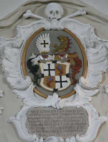2.11.1707 Franc Benedict von Baden, Landkomtur 1688-1707 (silbern-schwarz in 4 Reihen geschacht, Helmzier ein wie der Schild bez. Flug, Helmdecken schwarz-silbern). Elsässer und Schweizer Uradel, von da nach Baden eingewandert und dort begütert.