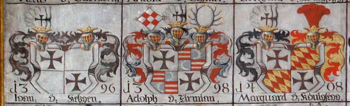 Landkomture in der Schloßkirche (1) - Landkomture in der Schloßkirche (2) - Landkomture in der Schloßkirche (3) - Landkomture in der Schloßkirche (4) - Landkomture in der Schloßkirche (5) - Chor, Hochmeister - Chor, Landkomtur - Scheitelbogen, Hochmeister - Scheitelbogen, Landkomtur - Wappentafel der Landkomture im Chor (1) - Wappentafel der Landkomture im Chor (2) - Wappentafel der Landkomture im Chor (3) - Wappentafel der Landkomture im Chor (4)