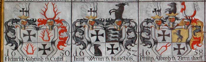 Philipp Albrecht von Berndorff zu Böhl und Steinbach, Landkomtur 1658-1666 (das Stammwappen ist geviert, Feld 1 und 4: In Gold ein schwarzer aus dem unteren Rand hervorkommender Bär mit goldenem Halsband, Feld 2 und 3: In Silber eine rote schräglinks liegende Zange, Helm 1 der Bär wachsend, Decken schwarz-golden, Helm 2 ein Paar übereck silbern-rot geteilte Büffelhörner, jedes außen mit 5 lanzettlichen Objekten besteckt.). Achtung - es gibt ein täuschend ähnliches Wappen Berndorff zu Köln 1717 (In silbern-rot geviertem Schilde in 1 und 4: ein goldenbewehrter rotgezungter schwarzer Bär, in 2 und 3: eine schräglinks gelegte silberne Stuhlwange. Helmzier der Bär wachsend). Vom Stammwappen Berndorff sind beide Elemente jeweils nur einmal verwendet worden, während die Felder 1 und 4 vom Deutschordenskreuz eingenommen werden. Helm 2 trägt hier das Deutschordens-Kleinod, Helm 3 trägt die Büffelhörner.