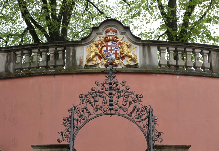 Damit stellt sich die Frage, wem konkret das Wappen über der Eingangstür zugeordnet werden kann: Der Schildinhalt kann sowohl Marquard Rudolf von Rodt als auch Franz Konrad von Rodt als Bauherrn des Umbaus zugeordnet werden. Wenn wie am Schloß die Kardinalsinsignien zu sehen sind, handelt es sich ganz klar um letzteren, denn nur dieser hatte die Kardinalswürde. Hier fehlt es aber, und da Franz Konrad von Rodt erst 1756 von Papst Benedikt XIV. zum Kardinalpriester ernannt wurde, wäre das Wappen im Zeitraum 1750-1756 auch ohne Kardinalsinsignien möglich. Franz Konrad von Rodt war ferner seit 1756 Träger des Großkreuzes des Johanniterordens zu Malta. Jenes Symbol fehlt hier unter dem Schild, also kommt auch nur der Zeitraum davor in Frage. Marquard Rudolf von Rodt scheidet insofern aus, als während seiner Regierungszeit noch nicht am Schloßgarten gebaut wurde. Erst unter Johann Franz II. Schenk von Stauffenberg (1704-1740) war 1710 Baubeginn am Neuen Schloß. Es wurde nicht vollendet, wahrscheinlich wegen der notorisch fehlenden Liquidität des Hochstifts und der gleichzeitigen Inangriffnahme des Priesterseminars. Im Gartenbereich konnte Gessinger nur noch den terrassierten Barockgarten mit einem Orangeriegebäude auf der unteren Terrasse gestalten. Dieser Wappenstein muß also in der Zeit des Umbaus unter Fürstbischof Kardinal Franz Konrad von Rodt entstanden sein, aber früher als die beiden Wappensteine am Neuen Schloß selbst angefertigt worden sein.