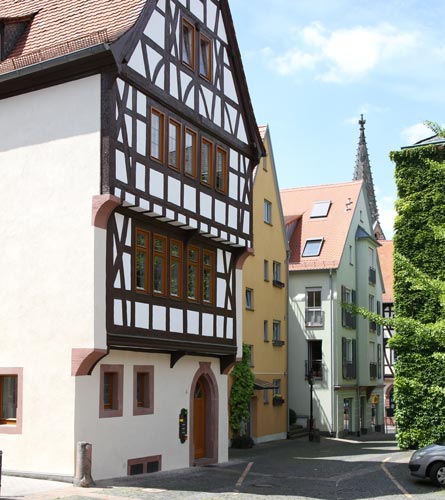 An dem Fachwerkhaus ist das Wappen der bürgerlichen Familie Flad auf dem trapezförmigen, auf 1539 datierten Türsturz angebracht. Der heutige Stein ist eine Kopie aus dem Jahr 1977; das Original befindet sich im Museum.