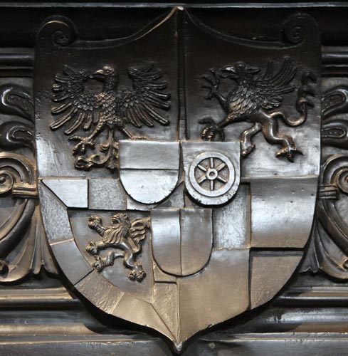Die sechs weltlichen Wappenschilde sind auf beiden Seiten die drei untersten. Im Jahr der Entstehung, 1525, führte Albrecht von Brandenburg ein Wappen mit acht weltlichen Inhalten im Hauptschild und drei geistlichen Inhalten auf den Herzschildchen (wie auf dem Mainzer Marktbrunnen). Von den acht weltlichen Inhalten wurden hier nur die sechs wichtigeren genommen. Es fehlen der Inhalt für das Fürstentum Rügen und einer von den vielen Greifen, wahrscheinlich der für das Herzogtum Kassuben (Cassuben, Kaschubei), so genau kann man das beim Fehlen von Tinkturen nicht festlegen. Zu sehen sind am Epitaph als zweitoberstes Paar heraldisch rechts in Silber ein roter Adler, auf den Saxen belegt mit goldenen Kleestengeln, für die Markgrafschaft Brandenburg (Feld 2 des entsprechenden Wappens), und heraldisch links in Blau ein roter Greif, für das Herzogtum Stettin (Feld 3 des entsprechenden Komplexwappens).