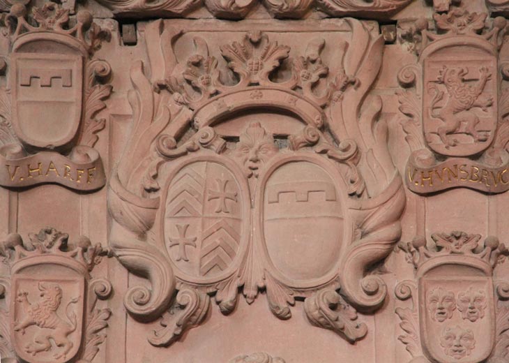 Auf der anderen Seite ist die Schildkartusche mit dem Wappen der von Harff zu Drimborn zu sehen, geteilt von Rot und Silber, oben ein dreilätziger blauer Turnierkragen. Die nicht dargestellte Helmzier wäre zu rot-silbernen Decken ein roter, hermelingestulpter Turnierhut, in dessen Stulp zwei Flügel stecken, rechts silbern, links blau. So wird das Wappen bei Wolfert, Tafel 26 Seite 47, 48, beschrieben, im Gruber sind die Tinkturen der Flügel umgekehrt angegeben.