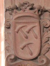 Das zentrale Ehewappen zeigt heraldisch rechts das Wappen der von Rollingen (de Raville), geviert, Feld 1 und 4: in Rot drei silberne Sparren (Rollingen), Feld 2 und 3: in Rot ein silbernes Ankerkreuz (Septfontaines, Herrschaft Siebenborn). Das Stammwappen dieser luxemburgisch-moselländischen Familie wurde seit der um 1370 erfolgten Hochzeit zwischen Jean III. de Raville mit Ermengard de Milberg, deren Mutter eine der letzten de Septfontaines (von Siebenborn) war, um dieses Symbol vermehrt geführt. Das hier nicht dargestellte Kleinod ist variantenreich und wäre vermutlich zu rot-silbernen Decken ein silberner oder auch ein natürlicher (blauer) Pfauenhals auf einem goldenen Kissen. Das Wappen wird beschrieben im Gruber S. 154, im Loutsch S. 664-665 und bei Wolfert Tafel 19 Seite 47 sowie im Siebmacher Band: Lux Seite: 13 Tafel: 12 und Band: Lot Seite: 12 Tafel: 9.