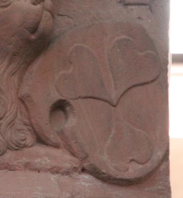 Heraldisch rechts unten ist das Wappen für die Großmutter väterlicherseits; es ist das der von Fischborn, in Silber ein gekrümmter schwarzer Fisch (Wolfert Tafel 51 Seite 49, Abb. unten links). Die hier fehlende Helmzier wäre zu schwarz-silbernen Decken ein schwarzer Fisch balkenweise vor einem grünen Baum. Gegenüber befindet sich das Wappen der von Trohe, in Schwarz ein dreiblättriges silbernes Kleeblatt (Wolfert Tafel 62 Seite 49, 143, ebenso im Westfälischen Wappenbuch, Abb. unten rechts). Die hier nicht dargestellte Helmzier wäre zu schwarz-silbernen Decken ein schwarzer Flug, beiderseits belegt mit drei dreipaßförmig zusammengestellten silbernen Blättern bzw. einem Kleeblatt ohne Stiel. Die von Trohe waren eine Ritterfamilie aus dem Busecker Tal und verwalteten dort als Ganerben Reichslehen. Die Zuordnung erfolgt nach Wolfert, und damit mittelbar nach Schäfer, und nach Hanna. Hier stimmen Epitaph und Stammtafel nicht ganz überein: Nach der Stammtafel der von Hutten hatte Ludwig von Hutten, Großvater mütterlicherseits des Verstorbenen, eine Anna von Fischborn geheiratet, sein Bruder Andreas von Hutten jedoch Margarethe von Trohe. So wird das auch bei Biedermann dargestellt, wobei diese Quelle alles andere als verläßlich ist.