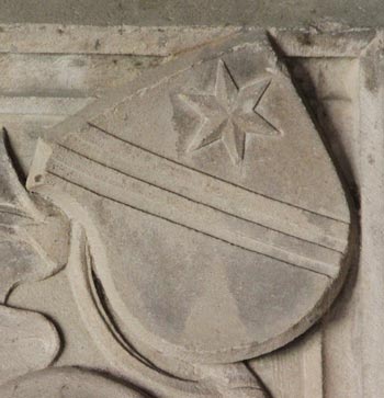 Das Wappen heraldisch oben links ist das der Mutter und des Großvaters mütterlicherseits, das hier eine besondere Bedeutung dadurch erhält, daß dieses Epitaph nicht nur für den Protagonisten, sondern auch für seine Mutter ist. Die von Döring führten einen von Schwarz und Silber durch vier Fäden in verwechselten Farben schräggeteilten Schild (Abb. unten rechts), oben links begleitet von einem silbernen, sechszackigen Stern. Die nicht dargestellte Helmzier wäre zu schwarz-silbernen Decken ein Paar silberner, je mit zwei schwarzen Balken belegter Büffelhörner. Das Wappen wird beschrieben bei Wolfert Tafel 14 Seite 69; im Siebmacher Band: NaA Seite: 21 Tafel: 30 sind die Abstände zwischen den Schrägteilungen erheblich weiter, so daß man dort den Schild blasonieren kann als fünfmal von Schwarz und Silber schräggeteilt, im linken Obereck ein silberner Stern.