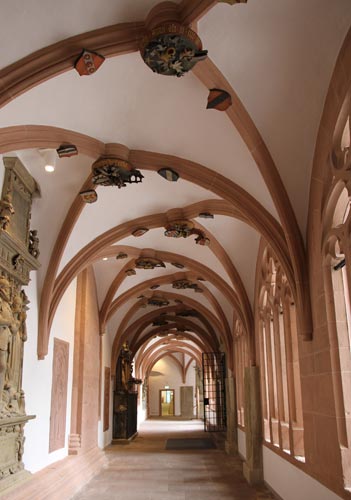 Abb.: Gesamtansicht des Ostflügels des Domkreuzganges. Die drei anderen Flügel besitzen ebenfalls wappengeschmückte Schlußsteine, doch sind diese weitaus weniger aufwendig und ohne die für den Ostflügel charakteristische Umgebung des Zentralwappens mit drei Ahnenwappenschilden, auch haben die Schlußsteine in den drei anderen Flügeln keine Kleinode zu den Wappen.
