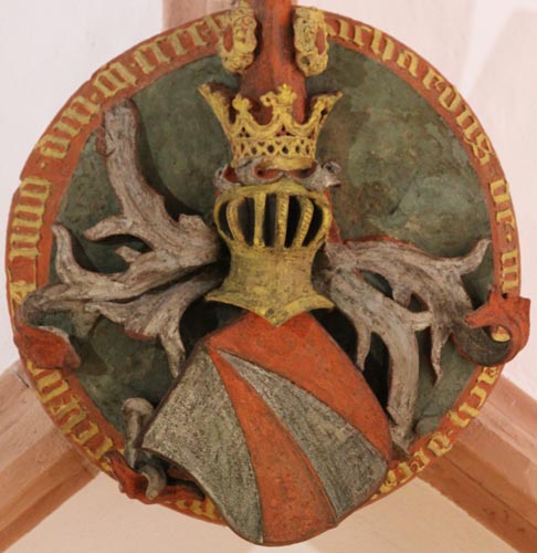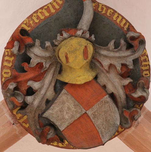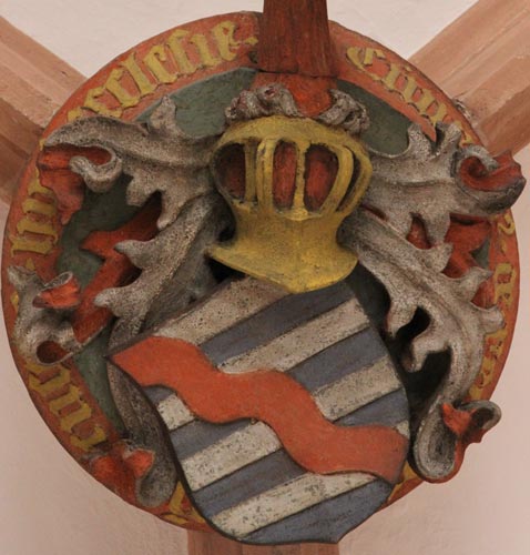 Abb.: Wappen der von Künsberg, in Blau eine silberne eingebogene Spitze. Helmzier ein silbern gestulpter flacher roter Hut, aus dem zwei rote Büffelhörner wachsen, an der Spitze jeweils mit einer Eichel besteckt. Helmdecken rot-silbern oder wie hier blau-silbern. Dieser Schlußstein steht für den Domkapitular Georg von Künsberg.