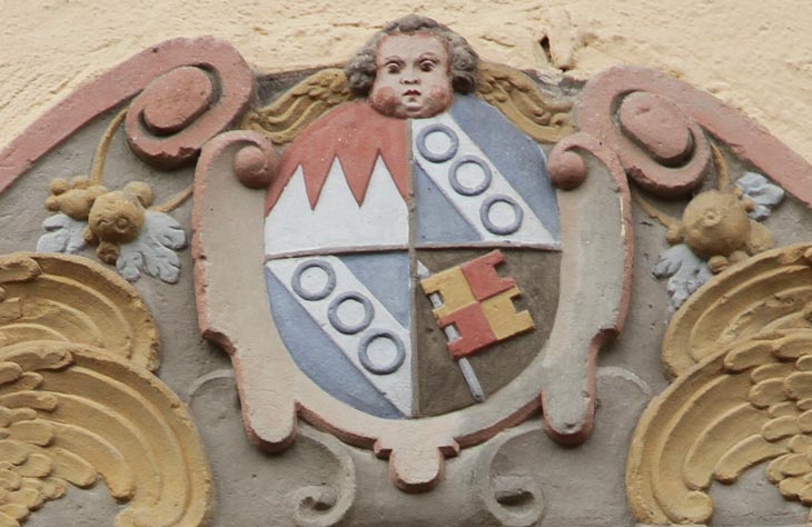 Die Wappenkartusche zeigt das in Unterfranken allgegenwärtige Wappen des Würzburger Fürstbischofs Julius Echter von Mespelbrunn (regierte 1573-1617). Der Wappenschild ist geviert: Feld 1: "Fränkischer Rechen" = von Rot und Silber mit drei aufsteigenden Spitzen geteilt, Herzogtum zu Franken, Feld 2 und 3: in Blau ein silberner Schrägbalken, belegt mit drei blauen Ringen, Stammwappen der Echter von Mespelbrunn, Feld 4: "Rennfähnlein" = in Blau (nicht schwarz wie hier!) eine rot-silbern gevierte (nicht golden-rot wie hier!), an den beiden senkrechten Seiten je zweimal eingekerbte, schräggestellte Standarte mit goldenem Schaft, Hochstift Würzburg. Beim Anstreichen des Feldes 4 ist dem Maler eine Verwechslung mit dem Würzburger Stadtwappen unterlaufen.