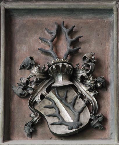 Abb.: Wappen der von Brende, Bautafel für Arnold von Brende, von Brend, von Brenden (in Silber ein schwarzes Hirschgeweih mit Grind, Helmzier zwei Hirschstangen oder ein ganzes Hirschgeweih, Helmdecken schwarz-silbern). Arnold von Brende studierte in Heidelberg und war spätestens 1426 Domherr in Würzburg. 1448-1466 war er Domkantor. Ab 1466 war er Domscholaster. 1466-1482 war er Cellarius. Außerdem war er Archidiakon, ab 1449 Oberpfarrer in Höchstatt. Zuletzt war er Senior des Kapitels. Er starb am 27.2.1484. Seine Originalgrabplatte im Domkreuzgang ging verloren. Sein Wappen ist auch im Ostflügel des Kreuzgangs auf einem Schlußstein zu finden.