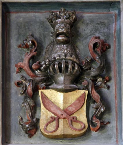 Abb.: Diese Tafel im zweiten Chor von Norden auf der Südseite mißt 110 cm in der Höhe und 80 cm in der Breite. Sie ist für Rudolf von Scherenberg. Hauptwappen: in Gold eine nach oben geöffnete rote Schere. Helmzier: Auf dem gekrönten Helm Kopf und Hals einen gekrönten silbernen Löwen. Helmdecken rot-golden (hier abweichend). In der heraldisch rechten oberen Ecke befindet sich noch ein einzelner Scherenberg-Schild als letzter Rest der Ahnenprobe, die einst vier Schilde umfaßte. Der Verlust der anderen drei Schilde und eines großen Teils der Bauinschrift erfolgte am 16.3.1945 durch den Bombenkrieg. Die Inschrift lautet(e): "Rudolf(us) de scheren/berg Scolastic(us) et Ca/no(nicus Ec)cl(es)i(a)e herbi(polensis)". Da es sich um den späteren Würzburger Bischof handelt, ist die Datierung hier durch ein enges Zeitfenster gegeben: Da er als Scholaster erwähnt wird, ergibt sich die Untergrenze 1458. Da er 1466 zum Bischof gewählt wurde, ist die Obergrenze jenes Jahr. Die fehlenden drei Wappensteine waren oben links von Massbach, unrten rechts von Egloffstein und unten links von Schaumberg. Alle Wappenschilde waren einst beschriftet, oben steht noch "Scherenberg" und "maßbach", unten stand einmal "Eglofstein" und Schawmberg". Das korrespondiert mit den Eltern, Erhard von Scherenberg (-1440) und Anna von Maßbach, sowie mit den Großeltern: Konrad von Scherenberg und Petronella von Egloffstein väterlicherseits, Richard von Maßbach und Anna von Schaumberg mütterlicherseits. Sein Wappen ist auch im Ostflügel des Kreuzgangs auf einem Schlußstein zu finden.