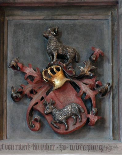 Abb.: Truchseß von Wetzhausen (in Gold zwei in zwei Reihen silbern-rot geschachte Balken, Helmzier: Zwei wie der Schild bez. Büffelhörner (Balken als Spangen), dazwischen ein Jungfrauenrumpf in roter Gewandung mit goldenem Zopf und ebensolcher Krone. Helmdecken rot-golden), Bautafel für einen Domkapitular. Beschreibung der Familie auf der vorigen Seite mit dem anderen Wappen im betreffenden Chor.