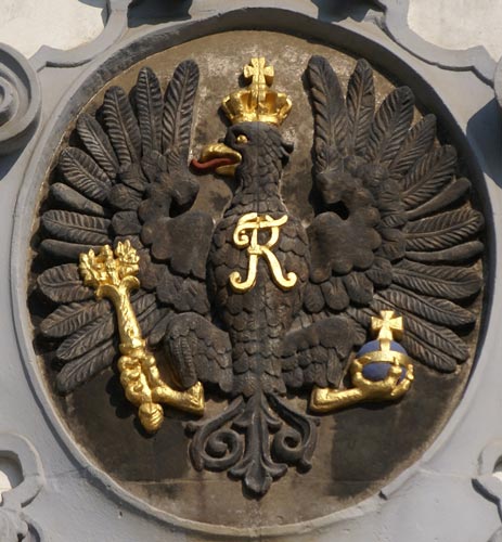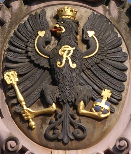 Auch an der Dompropstei ist im Dreiecksgiebel das preußische Wappen wie oben beschrieben angebracht. Dazu ein kleiner Rückblick: Zuerst hatte der Adler ab 1525 eine goldene Laubkrone um den Hals gelegt gehabt und auf der Brust die silberne Initiale "S" für Sigismund als Zeichen der Lehensabhängigkeit von Polen. Der Adler als solcher ist vom Reichsadler abgeleitet, der über das Hochmeistertum des Deutschen Ordens (Kaiser Friedrich II. verlieh dem Hochmeister Hermann von Salza um 1224 das Recht, den Adlerschild in das Hochmeisterwappen aufzunehmen) an den neugegründeten Preußischen Staat kam; die Farben sind sowohl vom Deutschen Orden als auch vom Stammwappen der Hohenzollern abgeleitet (Albrecht von Brandenburg aus der Ansbacher Linie, ein Neffe des Königs Sigismund von Polen, wurde am 5.1.1511 zum Hochmeister gewählt und wandelte den Ordensstaat in ein weltliches Herzogtum um). Die Kleestengel hatten ihr Vorbild im polnischen Wappen. Als Kurfürst Georg Wilhelm mit dem Herzogtum Preußen belehnt wurde, bekam der Adler einen Fürstenhut auf den Kopf; die Halskrone wurde aufgegeben, und die Initialen auf der Brust waren nun ab 1633 VG, für Vladislav IV., König von Polen und Lehnsherr, und Georg Wilhelm, Lehnsnehmer. Am 19.9.1657 erlangte Kurfürst Friedrich Wilhelm durch den Wehlauer Vertrag die volle Souveränität über Preußen, und sofort wurde die Initiale "C" des polnischen Königs von der Brust des Adlers getilgt, nur der Buchstabe "F" blieb. 1701 kam es zu weiteren Änderungen, als Kurfürst Friedrich III. von Brandenburg und seine Gemahlin Sophie Charlotte am 18.1.1701 in Königsberg gekrönt wurden. Damals wurden die königliche Krone auf dem Haupt des Adlers und das FR-Monogramm für König Friedrich I. auf der Brust eingeführt. Als König Friedrich Wilhelm I. 1713 an die Regierung kam, wurden das Zepter und der Reichsapfel in den Fängen eingeführt. In dieser Form wurde das Wappen bis 1921 beibehalten.