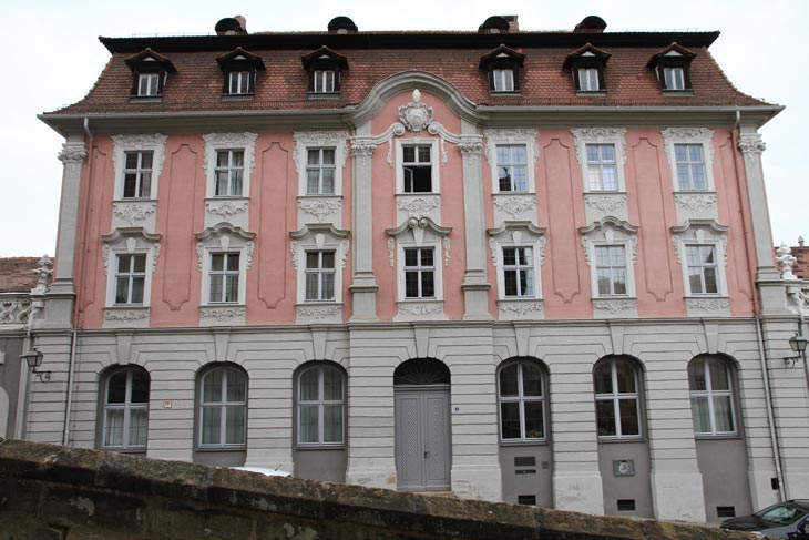 Architekt und Baumeister war der Bamberger Stadtmaurermeister Martin Mayer, beim Erstplan wie beim vollendeten Zweitversuch. Als Zimmermeister war Joseph Clemens Madler tätig. Es wurde eine großzügige Gestaltung mit einem siebenachsigen, dreistöckigen Hauptbau mit Mansarddach und mit zwei seitlichen, dreiachsigen Flügelbauten mit einer Zierbalustrade als oberem Abschluß. Der steile Anstieg der Straße führt zu einem sehr ungünstigen unteren Abschluß, denn ganz links schneidet die Straße unterhalb der Fensterbänke, während ganz rechts das Fugenrustika-Erdgeschoß wie auf Stelzen steht. Die optimale Höhe wird nur am mittig angeordneten Portal erreicht. Bei den Flügelbauten glich man den Höhenunterschied geschickt durch die zusätzliche Reihe von Ochsenaugenfenstern aus, so daß die Einfahrt im rechten Flügelbau wieder auf Straßenniveau liegt. Umgekehrt ist der linke Flügelbau wegen der starken Verkürzung der unteren Zone nur Blende. Tatsächlich sind die Abstände in der Höhe bei beiden Flügelbauten unterschiedlich, was aber nicht auffällt, weil die Reihe Ochsenaugenfenster sich genau entspricht und so durchgehende Symmetrie vortäuscht, die aber darunter nicht mehr aufrechtzuerhalten war. Die beiden oberen Stockwerke des Hauptbaus werden durch vier Kolossal-Pilaster zusammengefaßt, zwei an den Gebäudeecken und zwei die Mittelachse flankierend, die durch einen kleinen geschwungenen Giebel betont wird. Die Fassadenplastiken fertigte der Bildhauer Ferdinand Dietz an. Die Plastiken auf den jeweils mittleren Achsen der Flügelbauten wurden 1910 wegen Verwitterungsschäden abgenommen und 1914 durch Kopien des Bildhauers Johann Speth ersetzt.