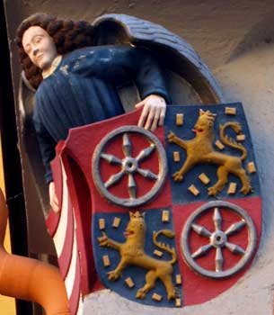 1475 zeigt der Wappenstein des Stadthauses (Mainzer Kanzlei) als Baujahr. Damit ist das Wappen (links oben und beide Aufnahmen unten) das des Mainzer Erzbischofs Adolf II von Nassau (geviert: Feld 1 und 4 Fürsterzbistum Mainz, in Rot ein silbernes sechsspeichiges Rad. Feld 2 und 3: Nassau: In mit goldenen Schindeln bestreutem Feld ein goldener, gekrönter Löwe), das andere das des Mainzer Domkapitels (korrekter: In Silber vier rote Balken, nicht 7x rot-silbern geteilt, aber das wird häufig so dargestellt). An einem weiteren Gebäude (am Stadttor) der Altstadt erinnert nur das Mainzer Rad an die Zugehörigkeit zum Hochstift Mainz (Abb rechts oben).