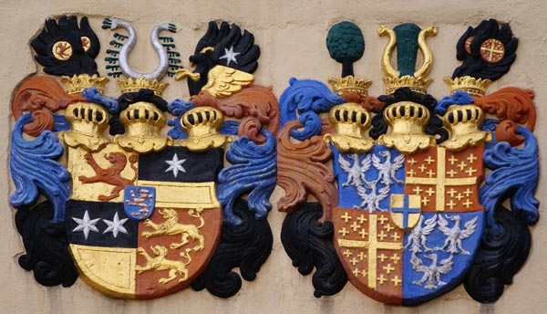 Hier am Tor zum oberen Schloßhof ist es das Wappen von Friedrich I., aber auch sein Sohn, Landgraf Friedrich II. von Hessen-Homburg gen. Prinz von Homburg, geb. am 30.3.1633 in Homburg v. d. Höhe, gest. am 24.1.1708 in Homburg v. d. Höhe, regierte 1680-1708, hatte eine Frau aus der gleichen Familie geheiratet, aber erst in seiner dritten Ehe: