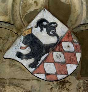 1. Abschnitt: Südseite, erster Wandabschnitt ganz im Westen, ganz links, Detailaufnahmen mittlere Reihe, rechter Abschnitt: Burggrafen von Nürnberg (innerhalb eines silbern-rot gestückten Bordes in Gold ein schwarzer doppelschwänziger Löwe, rot gekrönt; die Helmzier wäre zu rot-silbernen Decken auf einem roten, mit Hermelin aufgeschlagenen Turnierhut der schwarze Löwe sitzend zwischen zwei rot-silbern gestückten Büffelhörnern).