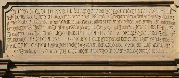 Die Bauinschrift ist unter dem Wappenstein, der am Kapellenflügel straßenseitig zwischen den beiden Rundbogenfenstern der Kapelle angebracht ist, angebracht und hat den Wortlaut: "Im Jahr Christi 1558 ist durch gottseelige Vermächtnuß MAURITII / Bischoffens zu Eichstatt und Domb:Probsten zu Würtzburg Freyherrns von Hutten dieses Spithal ge:/stifftet, dieses Gebäu(de) aber in diese Gestalt und Bequemlichkeit unter glorreicher Regierung vier nacheinan:/der gefolgten Bischoffen und Fürsten zu Würtzburg und Hertzogen zu Francken, JOANNIS PHILIPPI, / Freyherrn von Greiffenclau, JOANNIS PHILIPPI FRANCISCI, Reichs:Graffen von Schönborn / Buch(h)eim, CHRISTOPHORI FRANCISCI auch Freyherren von Hutten zum Stolzenberg, / FRIDERICI CAROLI, gleichfal(l)s Reichs:Graffen von Schönborn:Buch(h)eim auch Bischoffen / zu Bamberg von Anno 1713 angefangen und 1730 in diesen Stand gebracht worden."