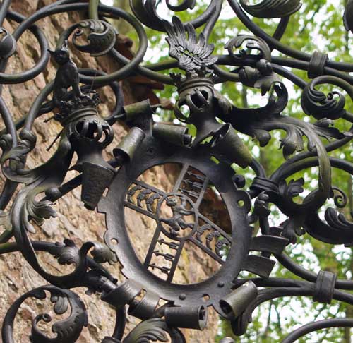 Eine moderne Zutat aus dem 20. Jh. aber sind die prunkvollen schmiedeeisernen Torflügel, die jeder ein Vollwappen in sich tragen. Zwischen all den floralen Ranken ist jeweils ein Wappen aus Schmiedeeisen eingearbeitet, komplett mit allen dazugehörigen Helmen. Auf dem linken Torflügel ist es das Wappen der Grafen von Luxburg, genauer das den Grafen Friedrich von Luxburg (21.8.1829-23.11.1905) mit zwei Helmen, auf dem rechten Torflügel ist es das seiner Gemahlin Prinzessin Louise von Schönaich-Carolath (4.11.1847-30.9.1929) mit vier Helmen.