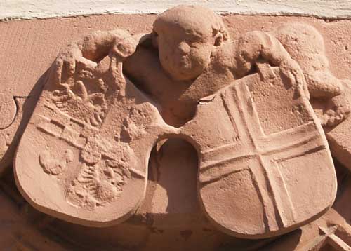 Ein weiteres Henneberg-Wappen findet sich in einem vermauerten Fenstersturz. Es ist als Allianzwappen ausgebildet, heraldisch rechts ein ziemlich verwittertes Familienwappen der Grafen von Henneberg, heraldisch links das Fuldaer Kreuz, beide Schilde von einem Engelchen gehalten.
