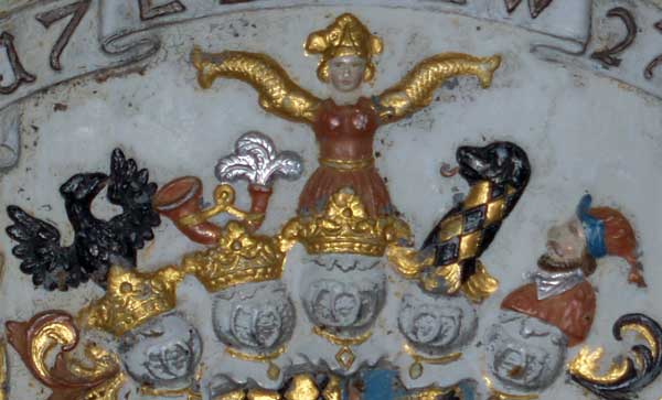 Hier wurde die Sache mit den Einzel-Helmdecken erheblich vereinfacht, rechts rot-golden, links schwarz-golden und fertig. Alternativ wurde auf diese Helmgalerie verzichtet und einfach ein Herzogshut oder eine Krone mit Wappenmantel verwendet.