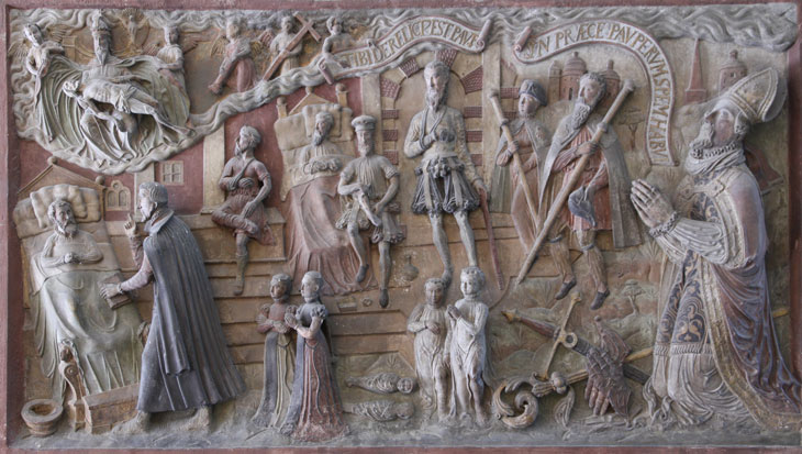 Abb.: Relief vom ersten Spitalbau im Durchgang des Fürstenbaus: Illustration der Gründung durch Julius Echter von Mespelbrunn.