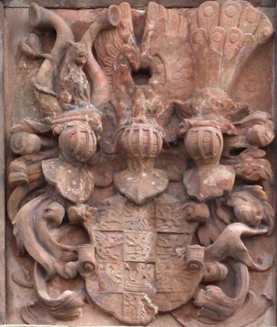 Renaissance-Portal, das jeweils ein zwölffeldriges Wappen mit