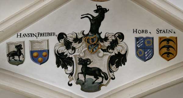 Das eigentliche heraldische Highlight ist aber die Decke: Die jeweils beiden einem der 16 Schlußsteine benachbarten Gewölbekappen im Scheitel der beiden Hallenschiffe sind mit Wappendarstellungen ausgemalt, immer ein Vollwappen in der Mitte, rechts und links jeweils von zwei weiteren Wappenschilden begleitet (4er Ahnenprobe), insgesamt haben wir damit 28 Vollwappen und 112 begleitende Wappenschilde, also zusammen 140 Darstellungen. Dadurch wird die Decke nicht nur bildgewordene Geschichte der zeitgenössischen (1592) adeligen Mitglieder des Eichstätter Domkapitels, sondern auch zum Armorial, zum Who's who des süddeutschen stiftsfähigen Adels.