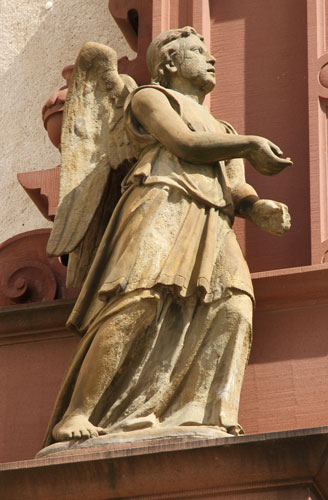 Das Rundbogenportal wird flankiert von zwei Säulenpaaren auf jeweils einem hohen Postament. In den Nischen zwischen den Säulen stehen links der Apostel Petrus mit Schlüssel und Buch und rechts der Apostel Paulus mit abgebrochenem rechtem Unterarm (beide Abb. oben). Die beiden Architrave der Säulenpaare tragen eine Verkündigungsgruppe, links der Verkündigungsengel Gabriel und rechts Maria. Beide strecken die Hände aufeinander zu und überbrücken durch diese Gesten den Zwischenraum. In der Mitte über dem Wappen gibt ein Rundbogenfenster Licht ins Innere; dieses wird flankiert von zwei Doppelpilastern. Deren Architrave tragen jeweils einen Sockel mit einer Bischofsfigur, Kilian als Frankenapostel und Burkard als erster Würzburger Bischof. Über dem Rundbogenfenster trägt ein gesprengter Rundbogengiebel auf einem Sockel eine gekrönte Marienfigur mit Jesuskind auf dem Arm. Diese wird von dem rundbogenförmig nach oben gezogenen Eierstabgesims der Balustrade umrahmt, und darüber erhebt sich als Abschluß ein Sockel mit Kreuz.