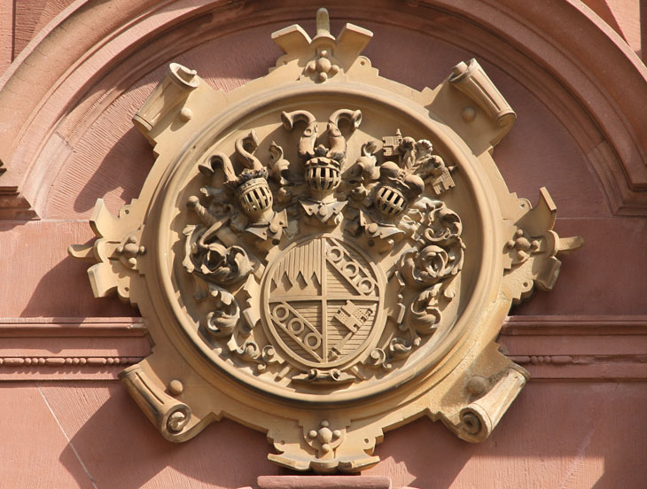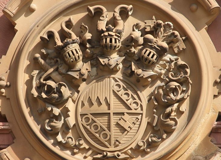 Zum Wappen gehören drei Helme: Helm 1 (Mitte): zu blau-silbernen Decken ein Paar blauer Büffelhörner, jeweils belegt mit einem silbernen Schrägbalken, der wiederum mit drei blauen Ringen belegt ist, Stammkleinod der Echter von Mespelbrunn, Helm 2 (rechts): zu rot-silbernen Decken ein Paar Büffelhörner, jeweils im Spitzenschnitt rot-silbern geteilt, Herzogtum zu Franken, Helm 3 (links): zu rot-silbernen Decken drei Straußenfedern in den Farben Silber, Rot und Blau zwischen zwei rot-silbern gevierten Standarten mit goldenem Schaft, Hochstift Würzburg.