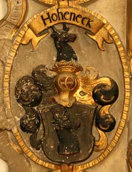 Wappen der von Hoheneck, in Silber Kopf und Hals eines schwarzen Ochsen mit roten Hörnern. Auf dem gekrönten Helm Kopf und Hals des wie im Schild bez. Ochsen wachsend, Helmdecken schwarz-silbern. Hier gewendet.